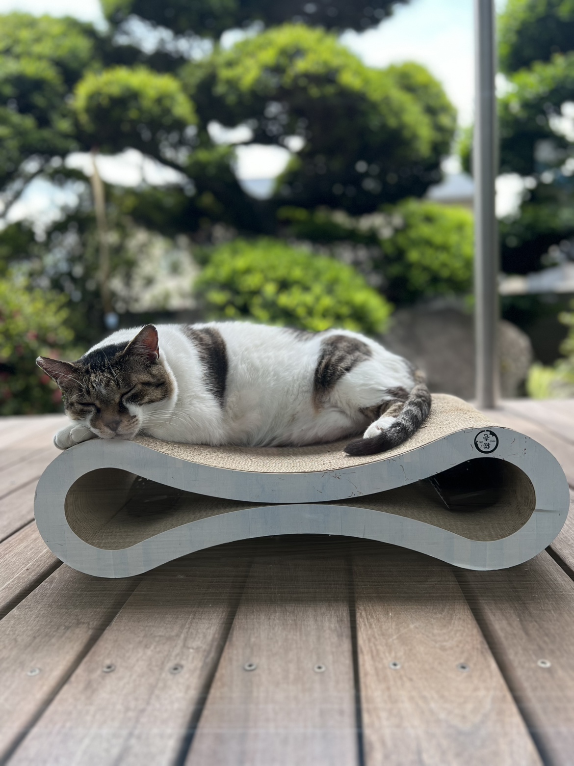 庭自体は静かで動きが少ないのですが、虫の音や天候の移ろい、そして時折訪れる鳥や蝶が、目を楽しませてくれます。しかし、一番の癒しは、縁側に遊びに来てくれる猫との語らいです。多い時には五匹ほど来ていたのですが、今は一匹だけ。名前は「ぶーちゃん」と呼んでいます。