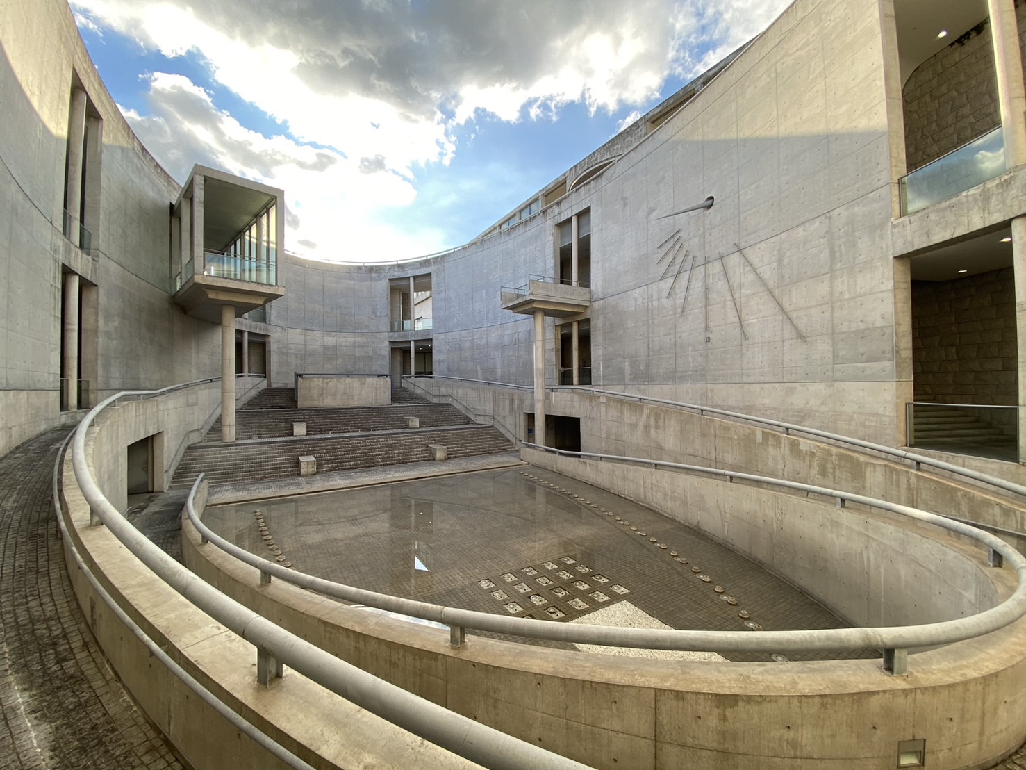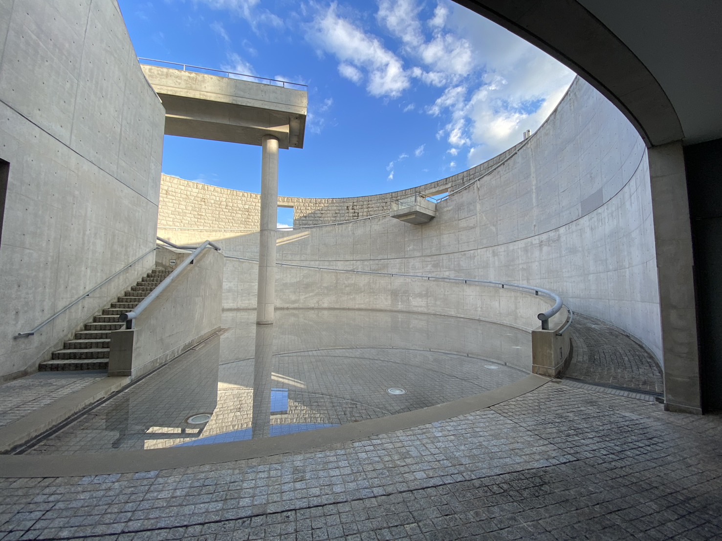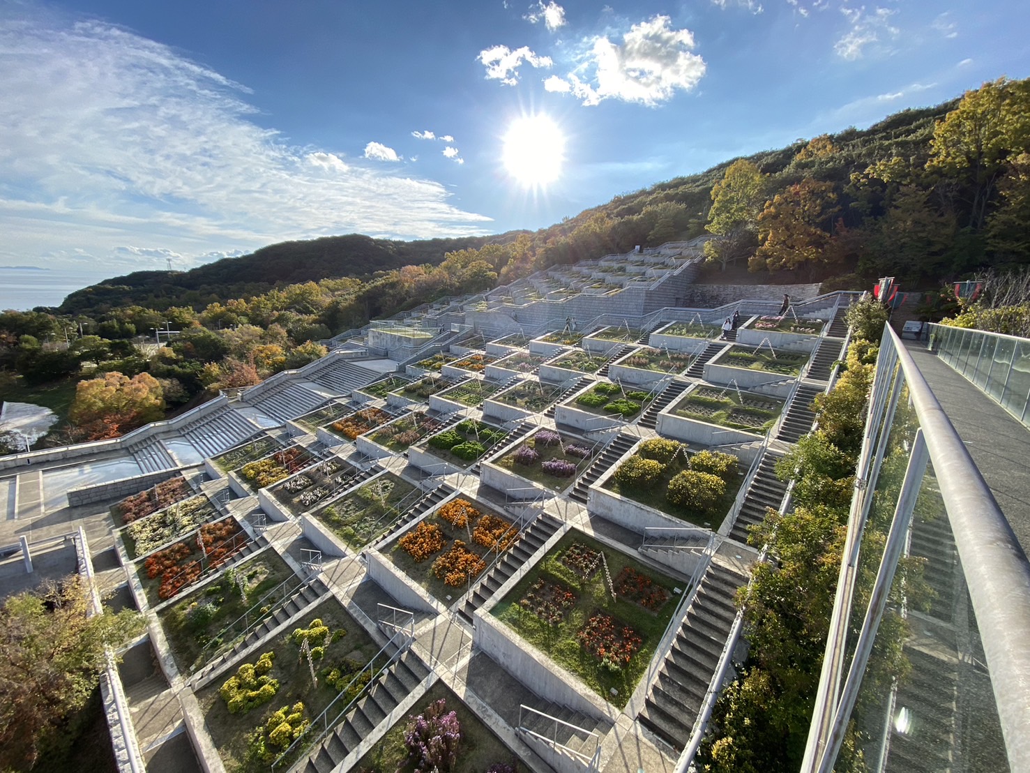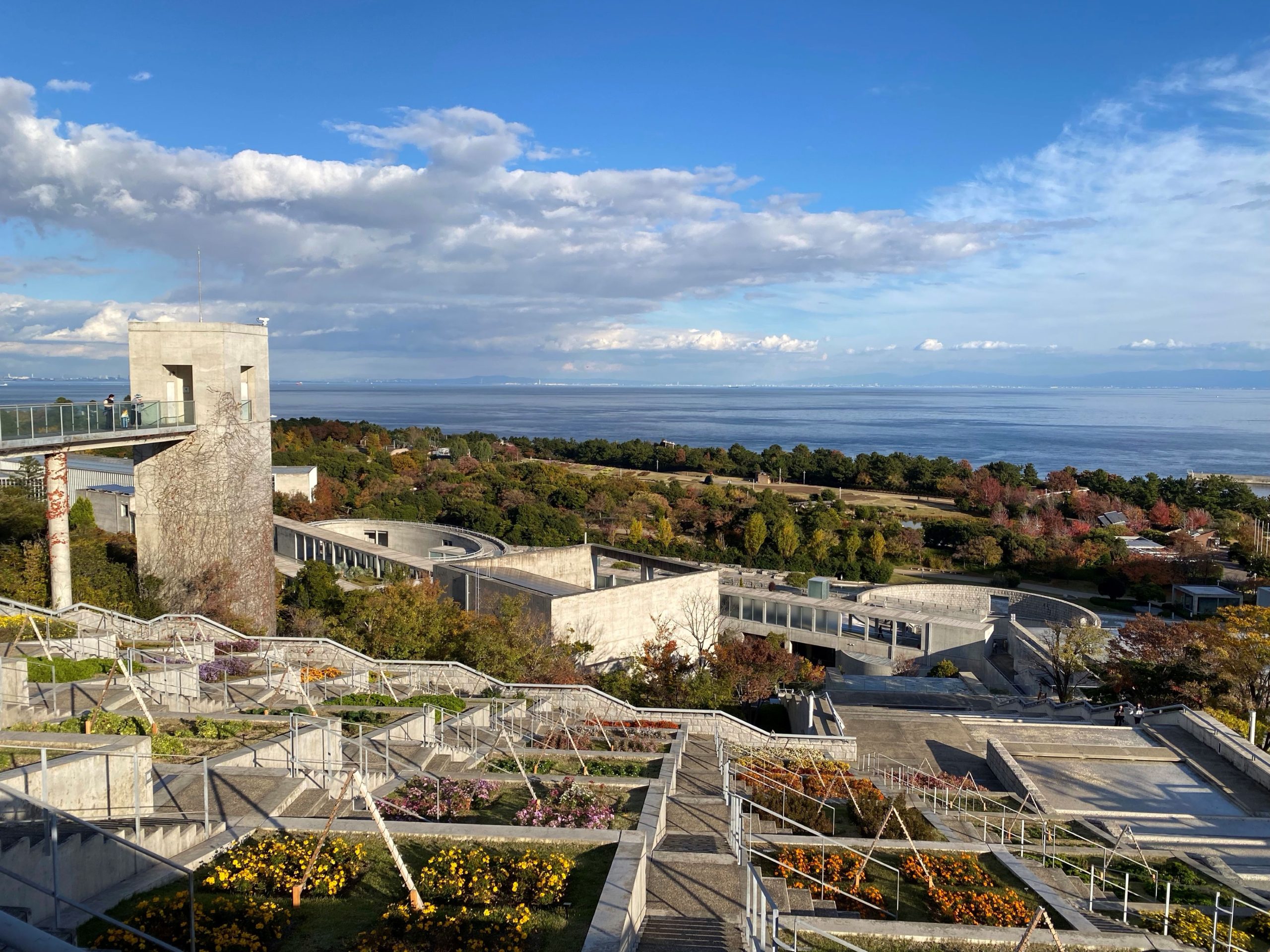 階段を上る途中では前方に花壇と山の風景が広がり、振り返ると大阪湾を一望できる開放的な景色に変わります。コンクリートという人工的な素材でつくられた建築が、地形や植栽を取り入れることで自然と調和している点がとても印象的でした。