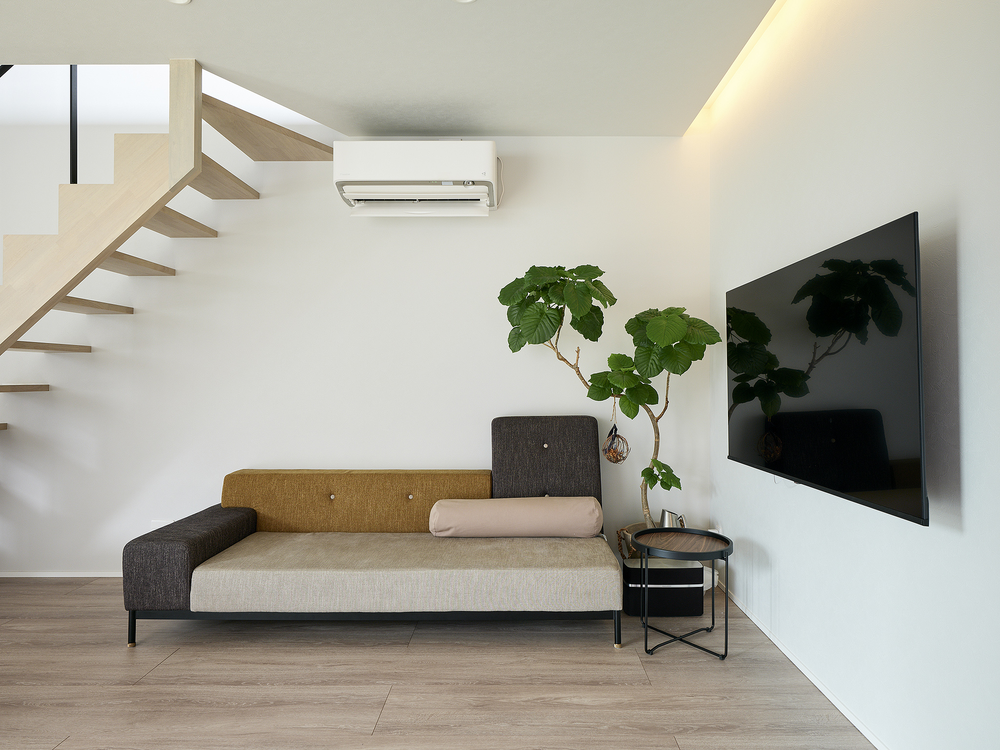 内部空間では、LDKに大きな開口部を設け、お庭の緑が自然と目に入る穏やかな景色を暮らしに取り込めるよう配慮しました。さらに、カフェのような落ち着きのある間接照明を取り入れ、時間帯によってやわらかな表情を見せる心地良い空間にしています。