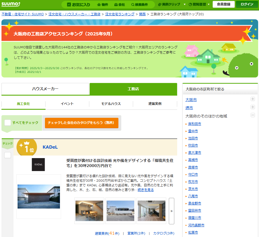 SUUMO大阪府の工務店アクセスランキング(2025年9月)第1位を獲得しました